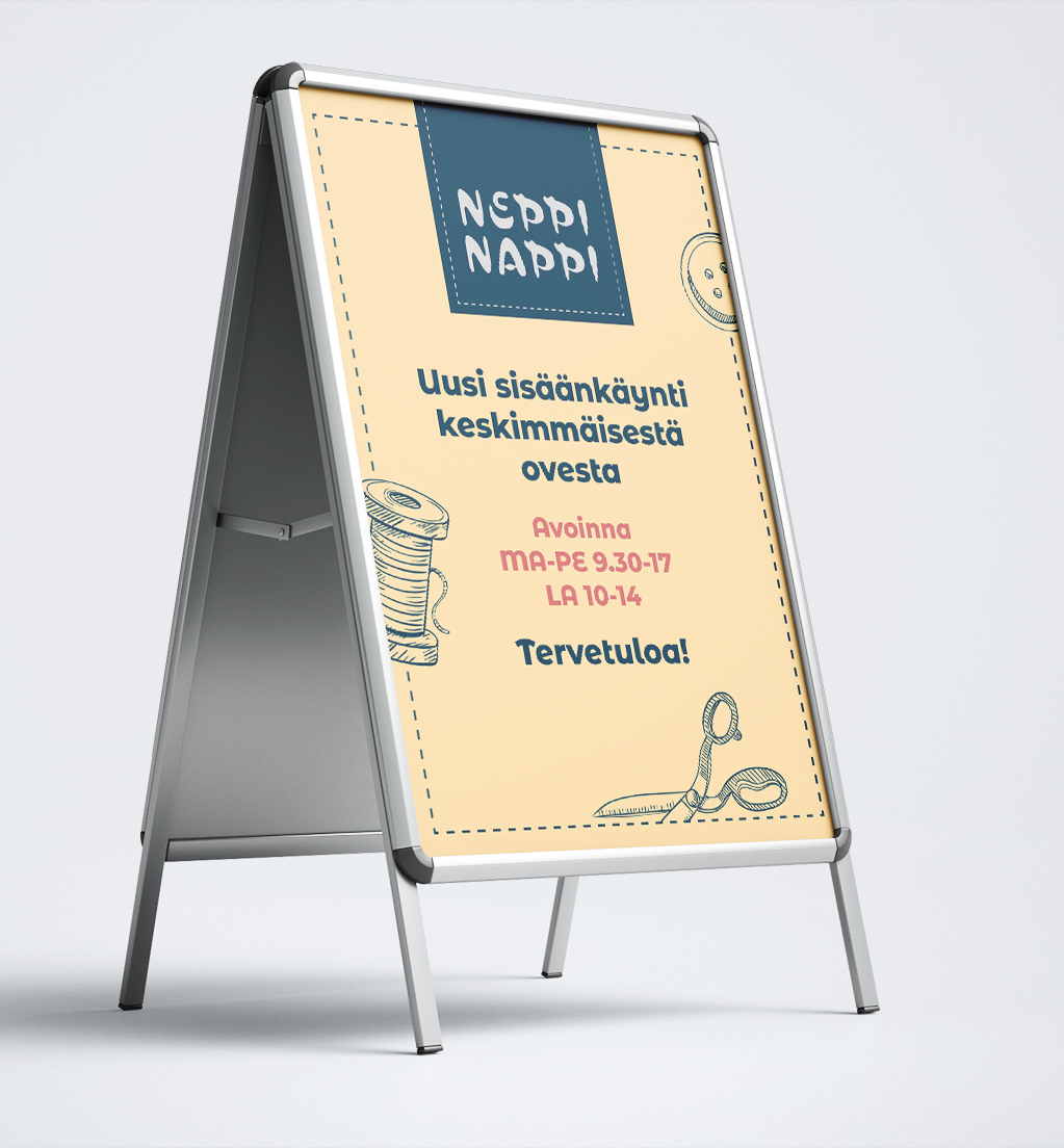 Perinteikäs käsityöliike Neppinappi on sijainnut Lahden torin kulmalla vuodesta 1939. Uusi kauppias hypppäsi puikkoihin ja sen myötä oli ilmeen päivityksen aika. Historia haluttiin säilyttää kuitenkin tuoden yritys tähän päivään. Logo säilyi sellaisenaan muodoltaan ja Neppinapille päivitettiin klassinen väripaletti ja piirretty kuvamaailma.
